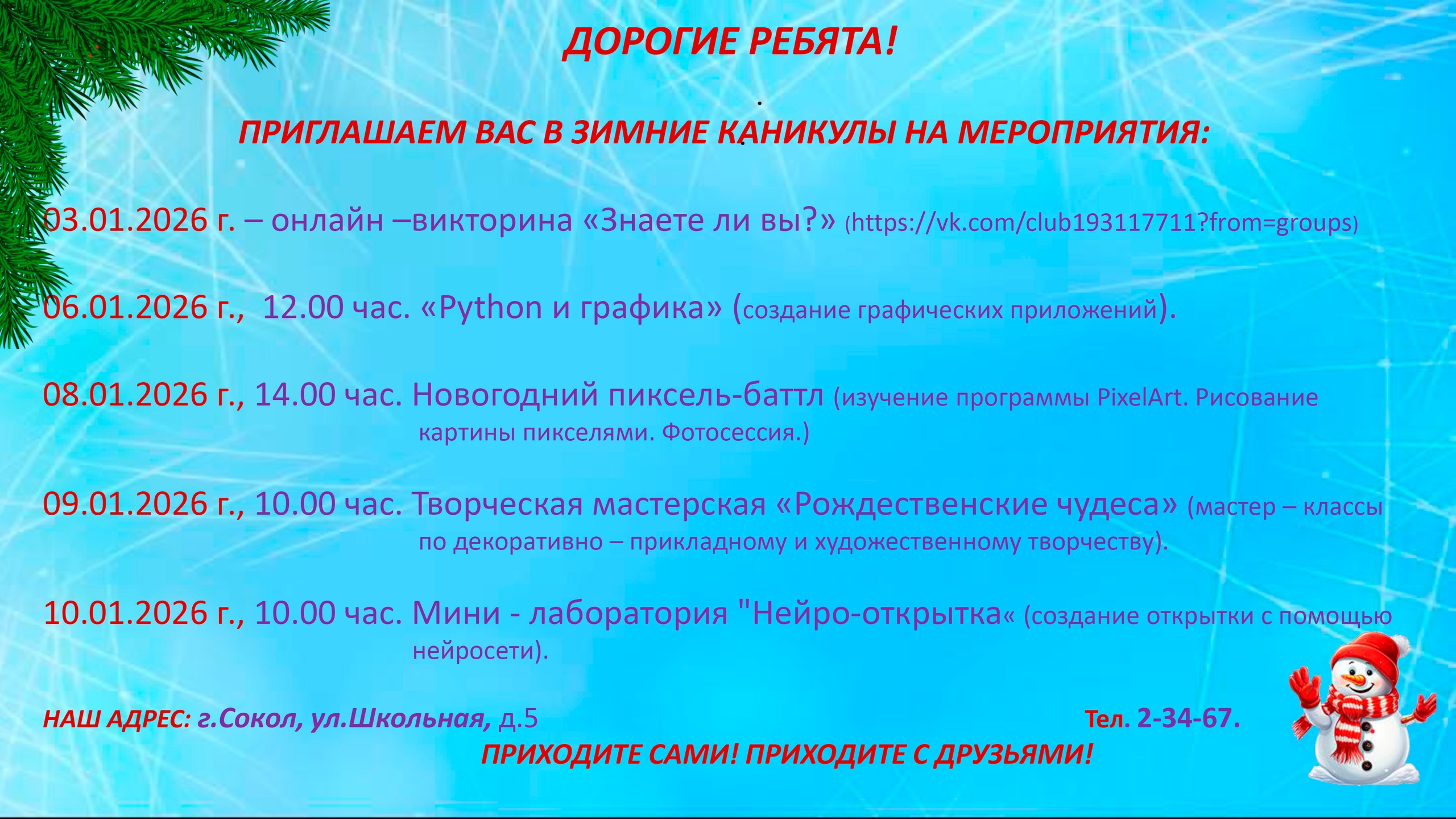 ПЛАН МЕРОПРИЯТИЙ В ЗИМНИЕ КАНИКУЛЫ!