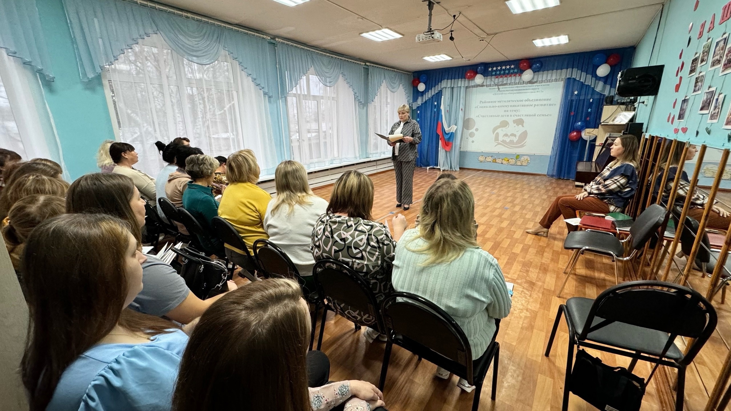 11 ноября в БДОУ СМО "Детский сад №13" состоялось районное методическое объединение (руководитель М. Л. Мозолина).11 ноября в БДОУ СМО "Детский сад №13" состоялось районное методическое объединение (руководитель М. Л. Мозолина).Тема встречи "Формирование семейных ценностей у детей дошкольного возраста через вовлечение родителей в образовательный процесс".С. Н. Пеганова познакомила слушателей с современными подходами к взаимодействию с родителями в соответствии с ФОП ДО.Н. В. Славнухина представила открытое занятие в подготовительной группе "Самое дорогое, что есть у меня - это моя семья".Педагог - психолог Н. В. Губкина представила модель конструктивного общения с родителями.Учитель - логопед Л. А. Федотова провела Мастер класс " Культура речи рождается в семье".Коллектив представил опыт проектной деятельности с родителями.Музыкальный руководитель Н.А. Грекова провела практикум " Танцуем табату или здоровая семья - здоровое общество.Участники встречи отметили положительный опыт дошкольной организации, наметили каждый для себя точки роста в работе с родителями.